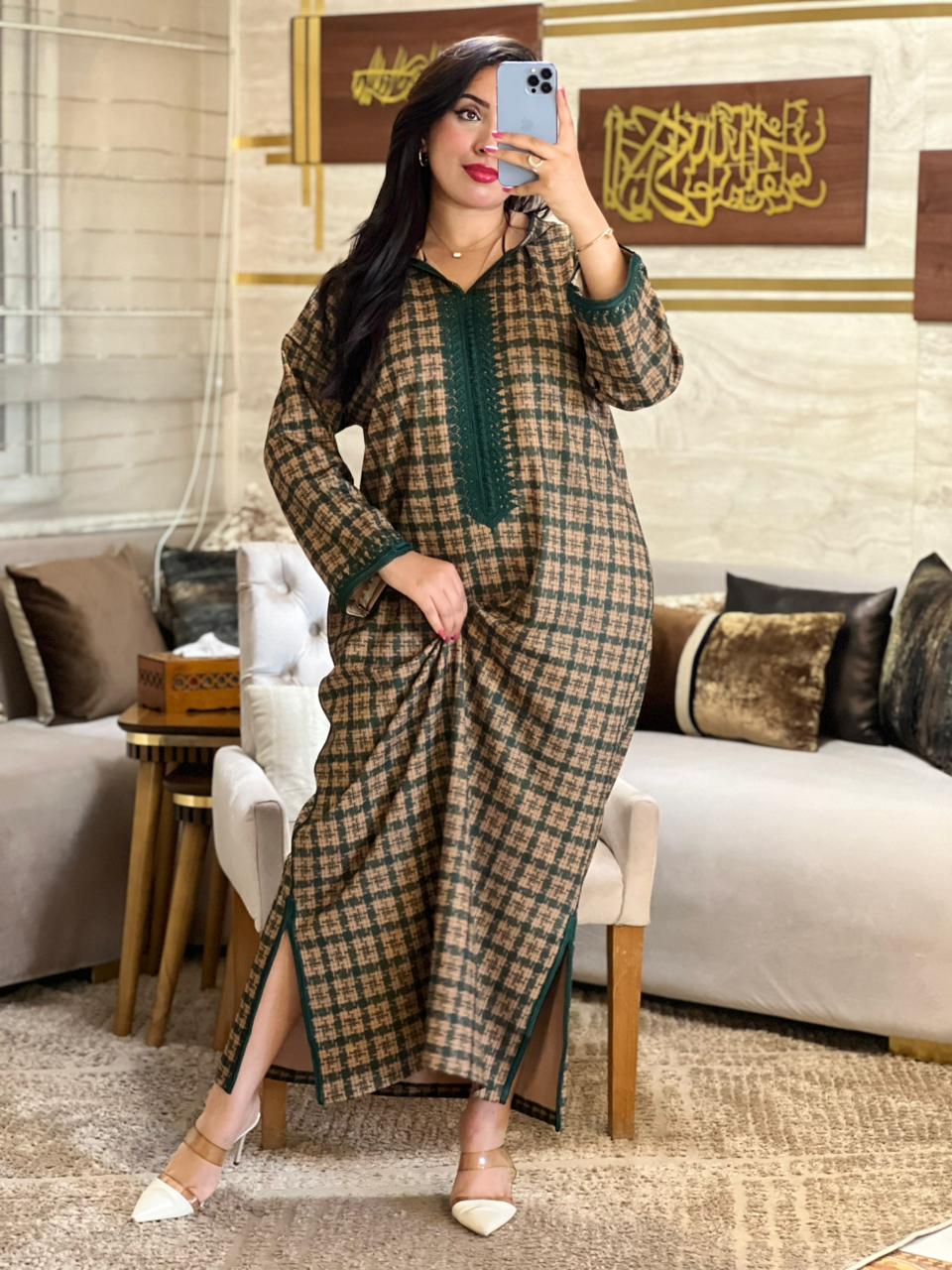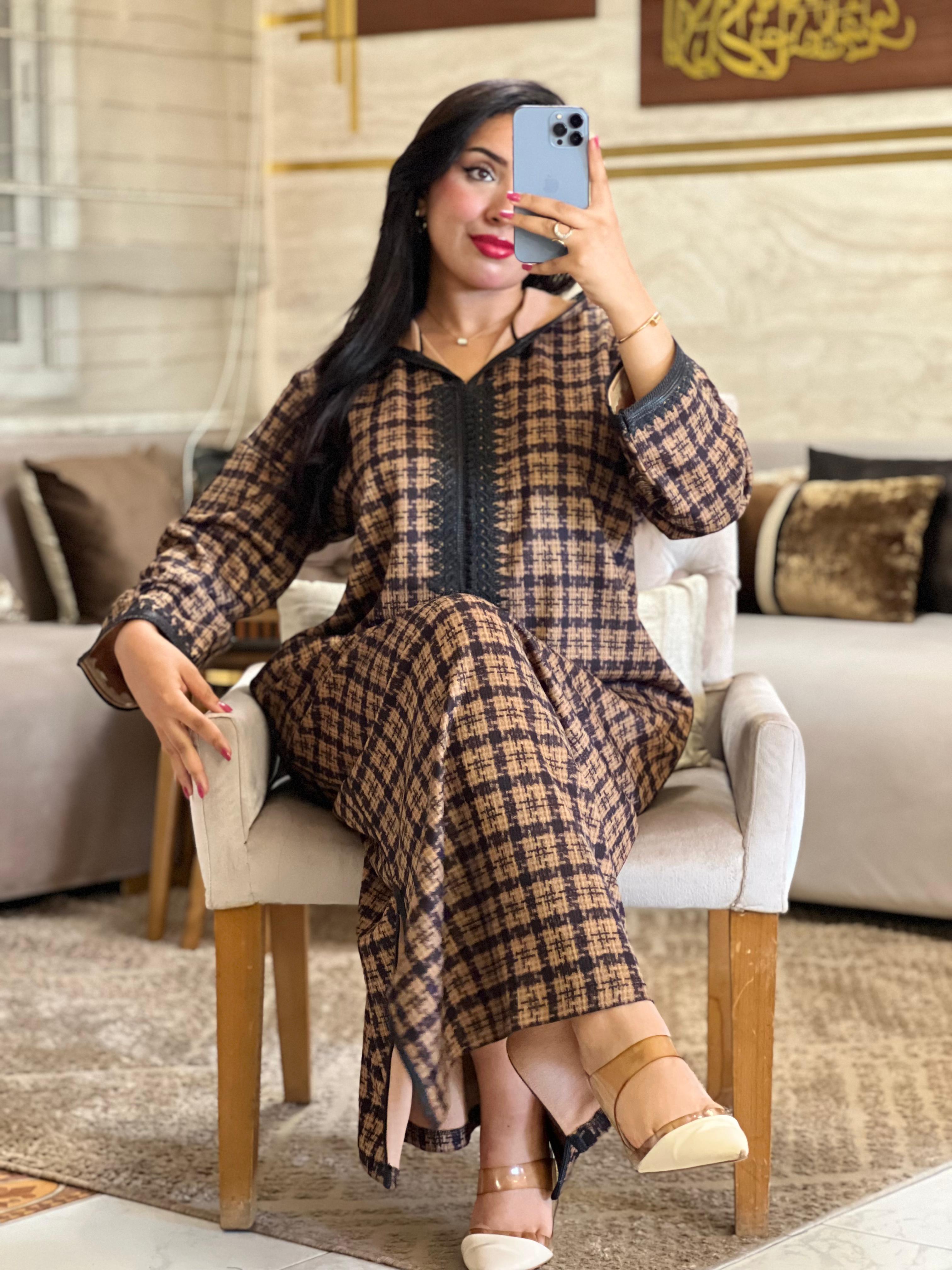 تميّزي بإطلالة مغربية راقية مع جلابة بنقوش مربعة مصنوعة من صوف مستورد عالي الجودة.