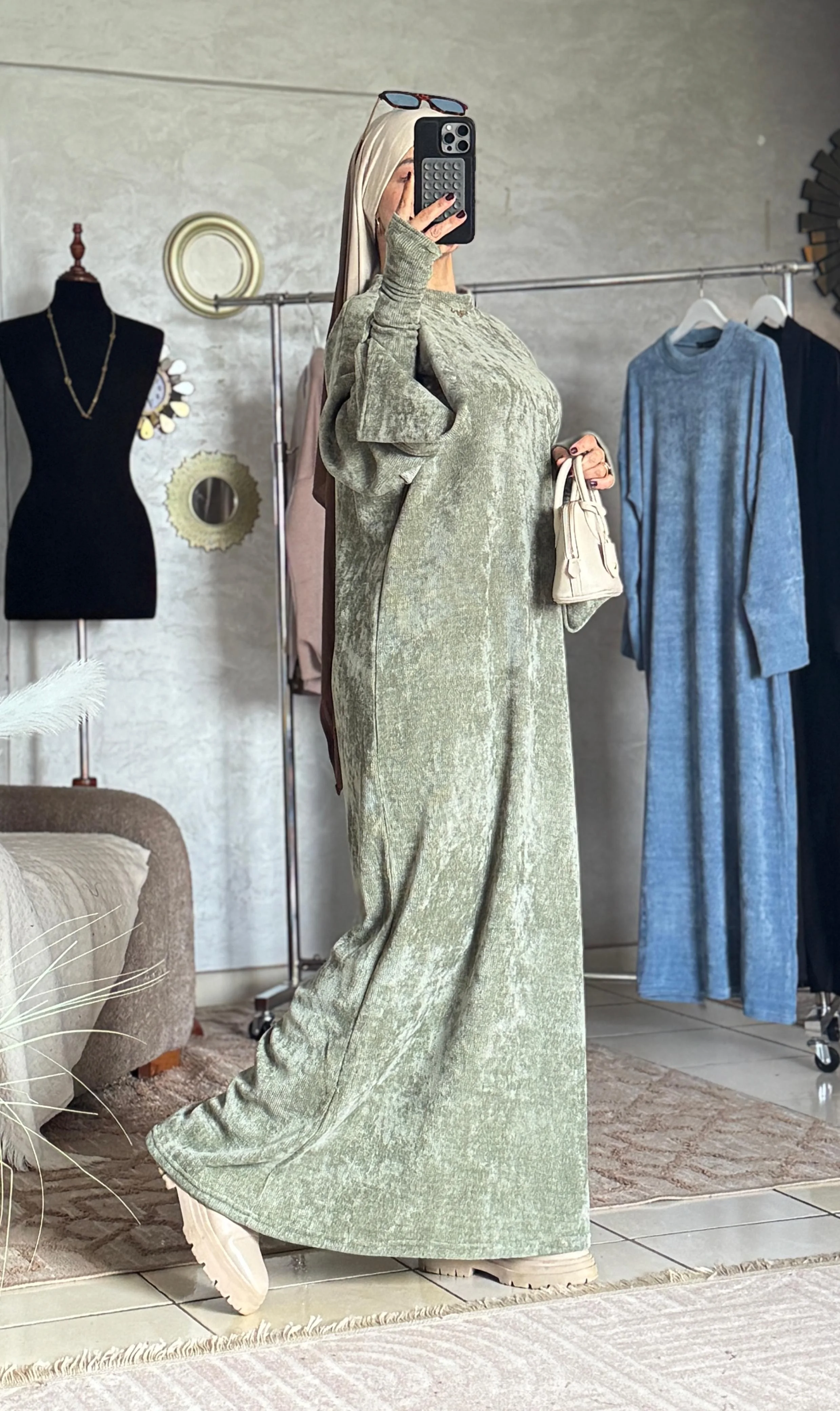 فستان راقٍ مخدوم من قطيفة عالية الجودة، ناعم ومريح ويمنحك إطلالة أنيقة ومميزة.