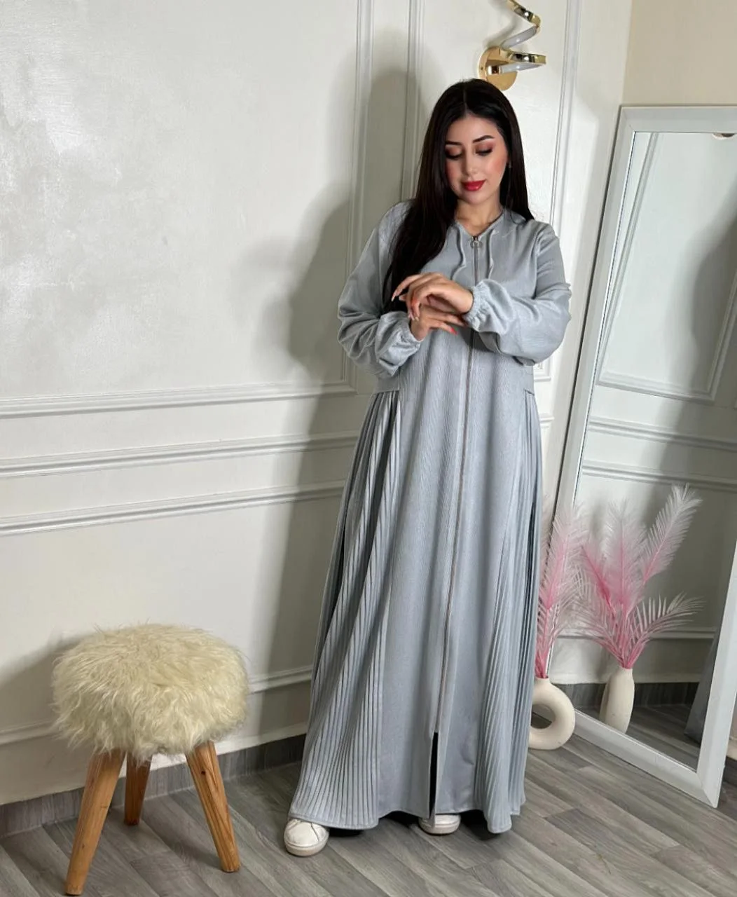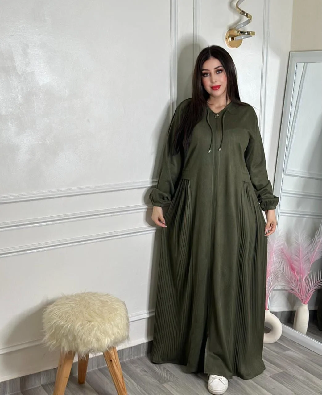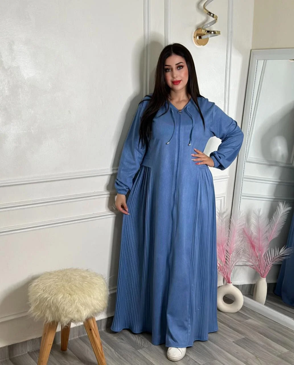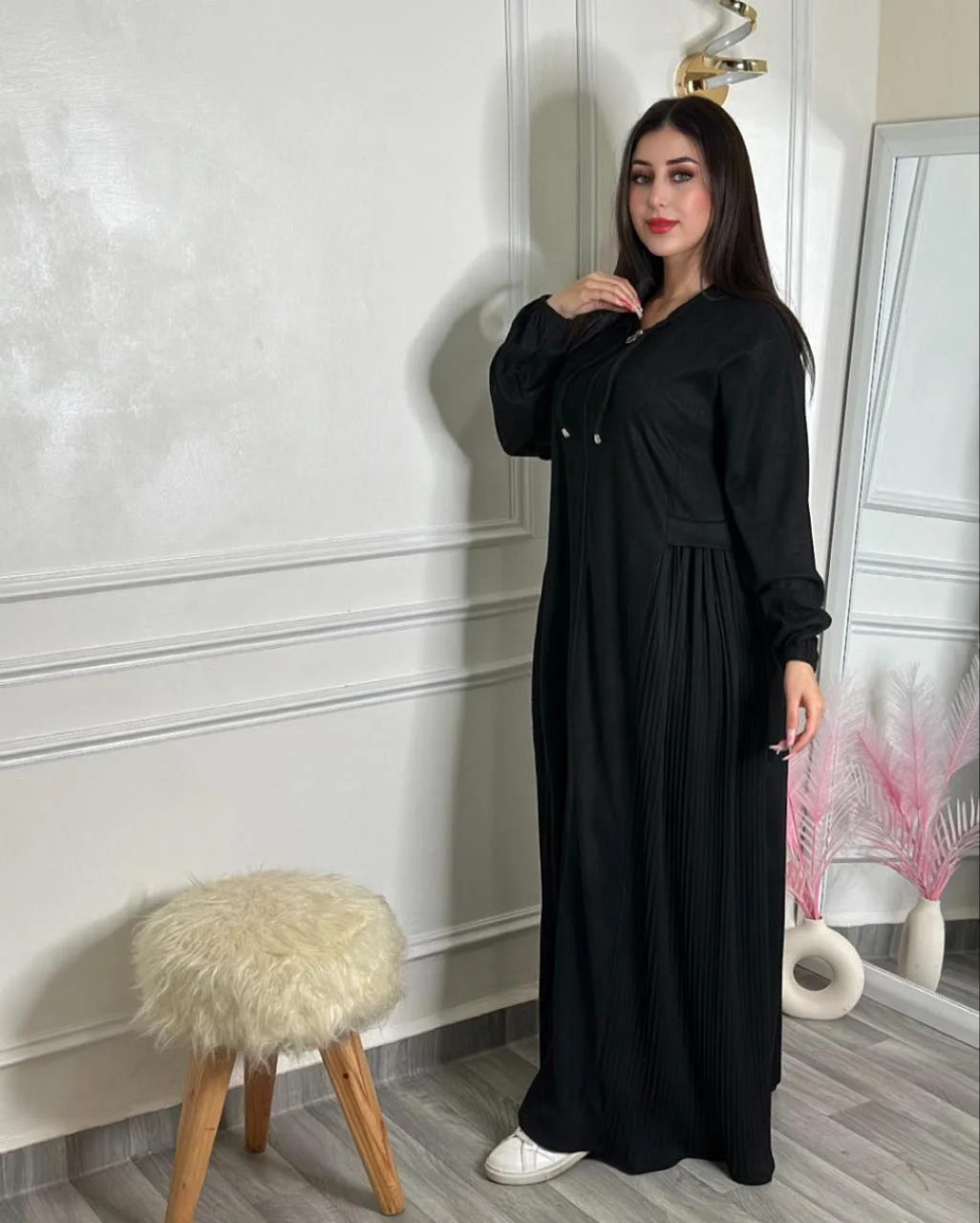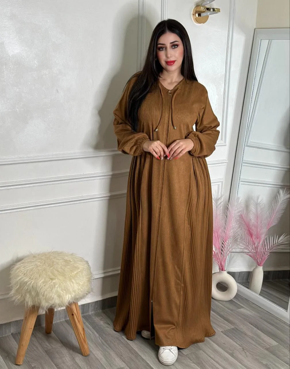 فستان راقٍ مخدوم من قطيفة عالية الجودة، ناعم ومريح ويمنحك إطلالة أنيقة ومميزة.